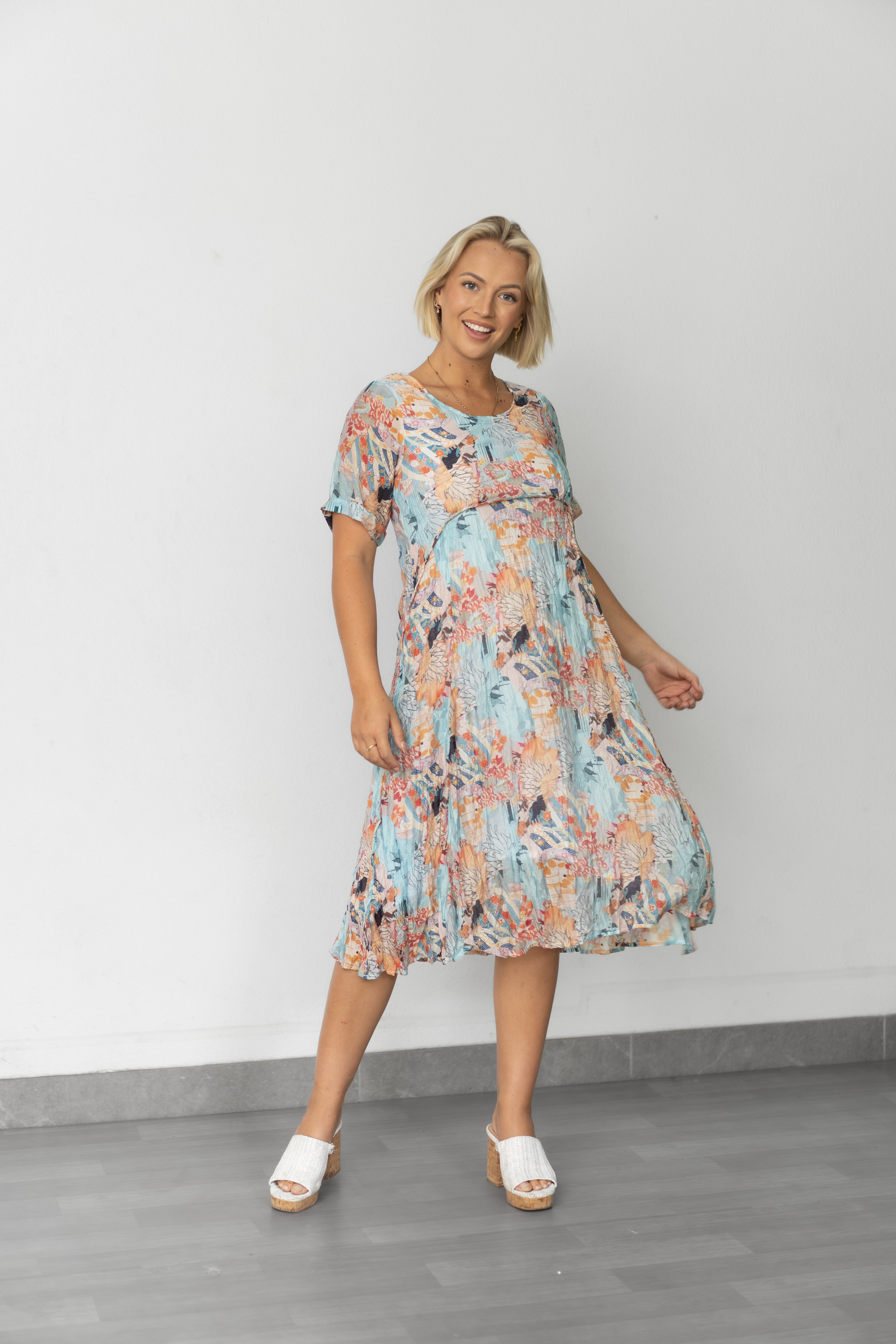 38592DH BL VISCOSE POLYESTER JAPANESE PRT PANELED S/S DRESS size 8-20