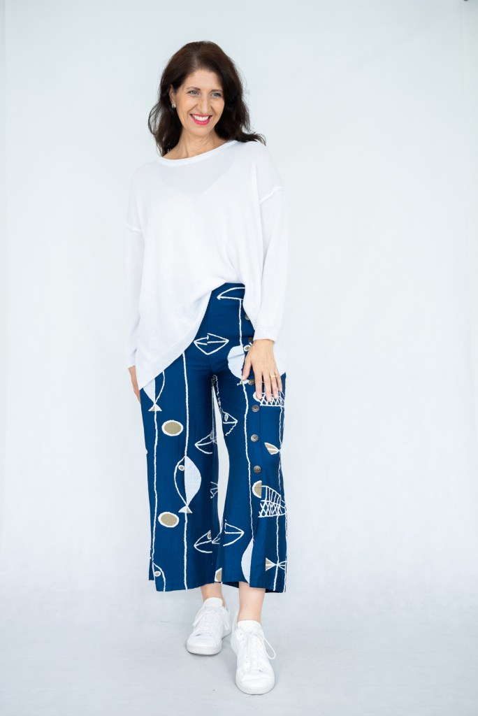 LINEN/RAYON FISH PRT SIDE BTN SPLIT PANT