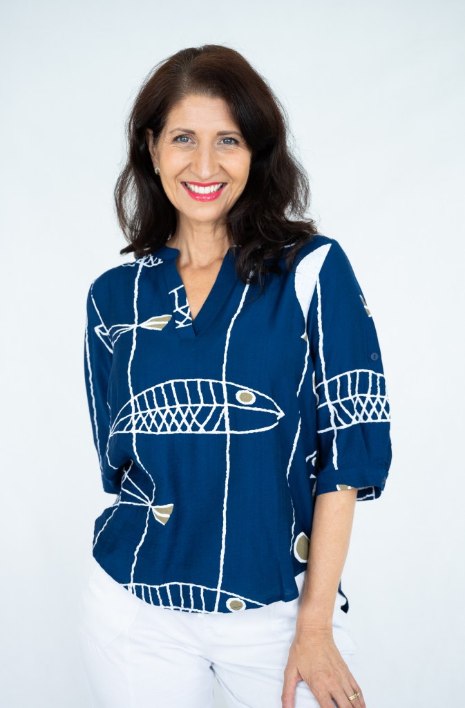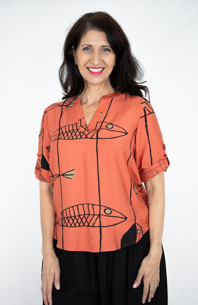 LINEN/RAYON FISH PRT V NK BLOUSE