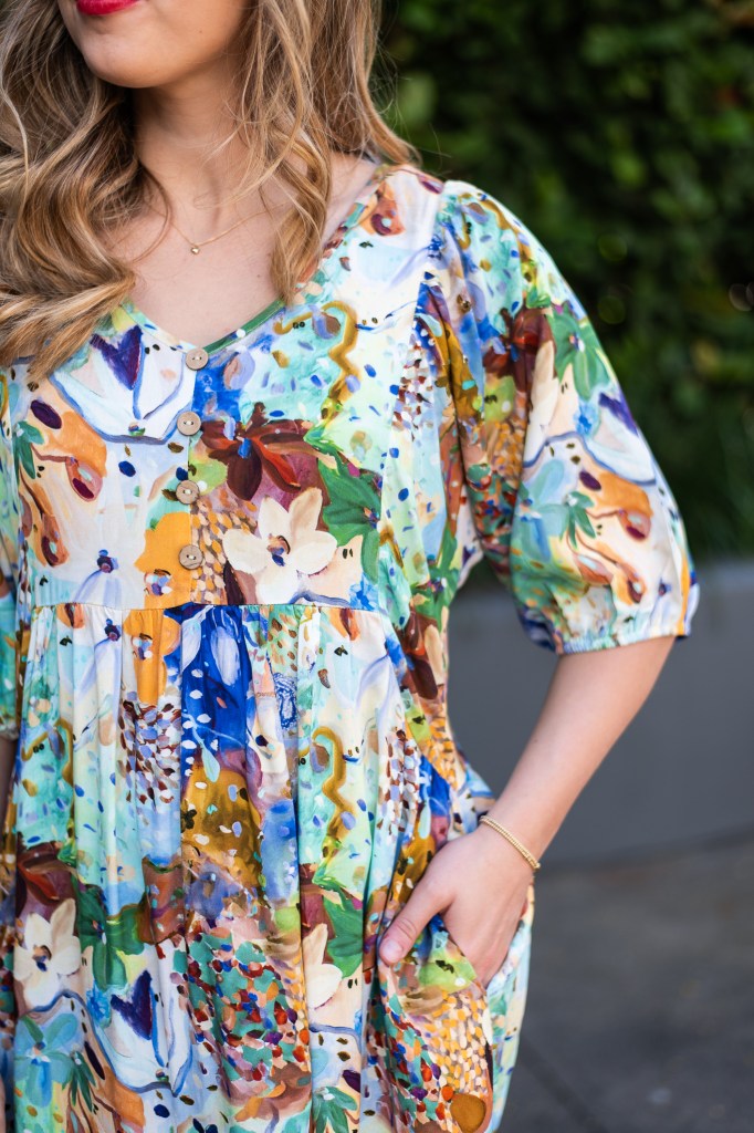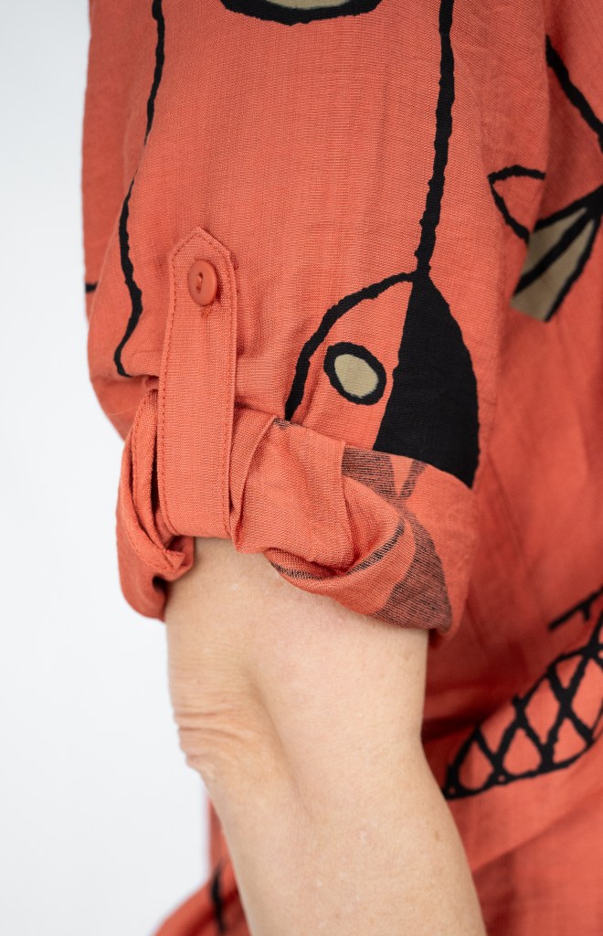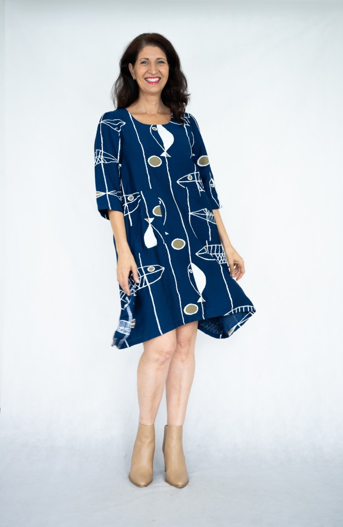 LINEN/RAYON FISH PRT POCKET DETAIL 7/8 SLV DRESS