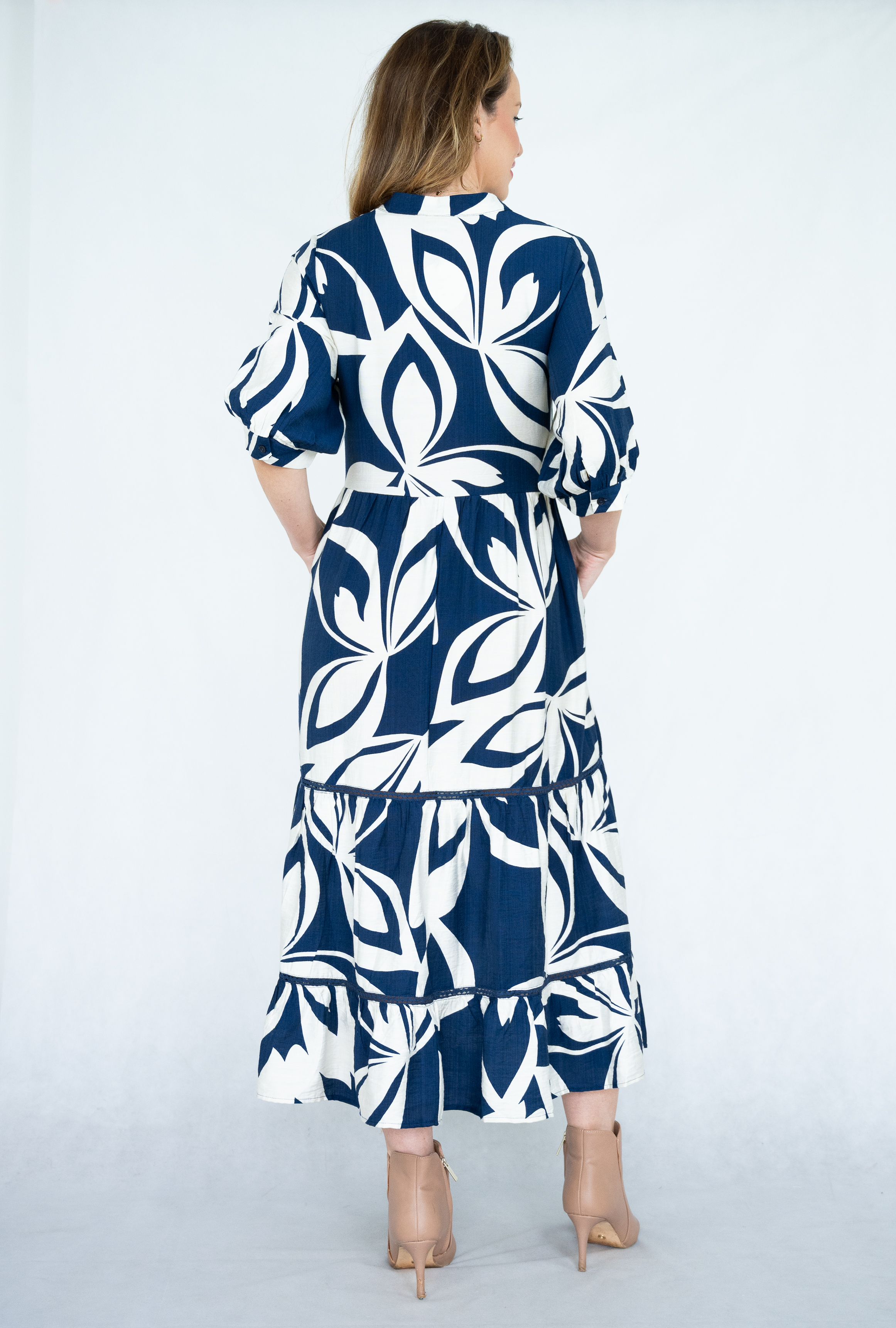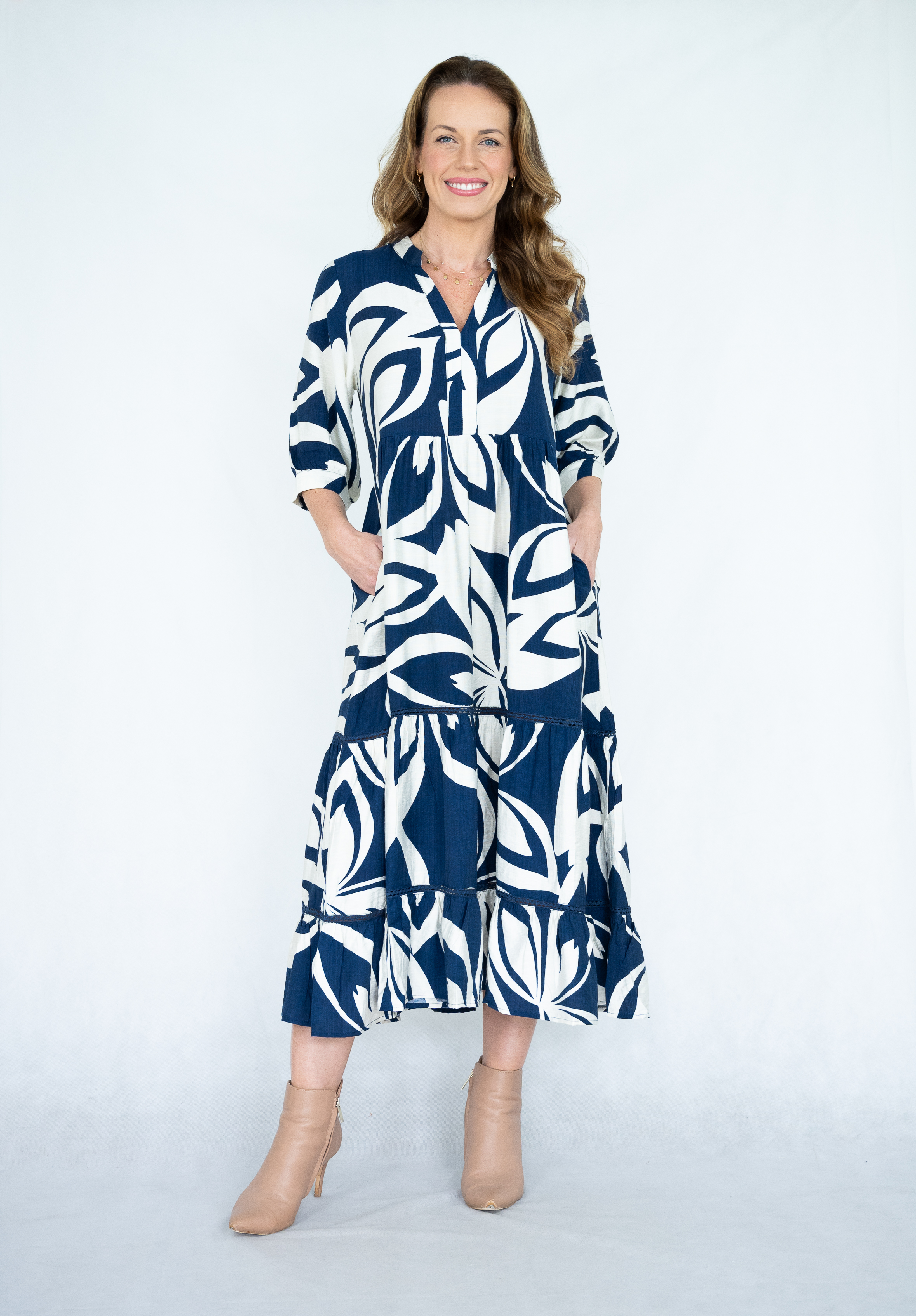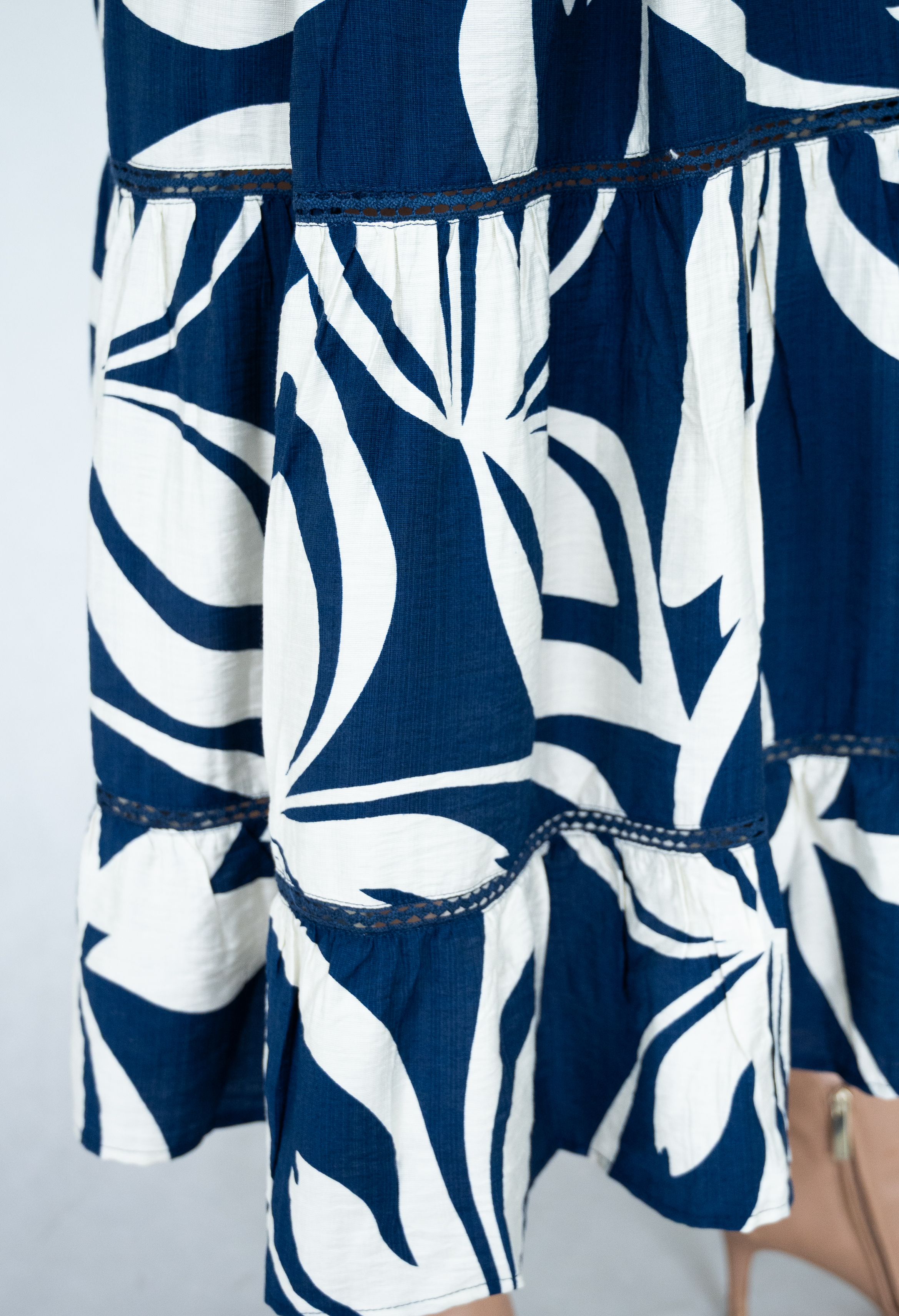 VISCOSE/POLY ABSTRACT PRT V NECK LACE TRIM TIERED DRESS