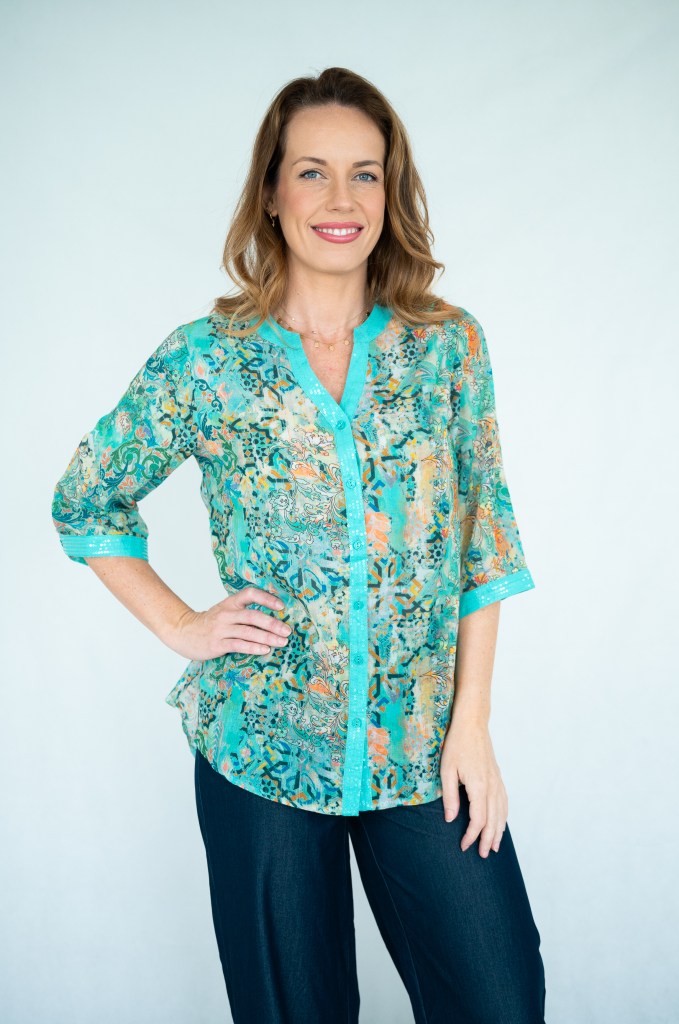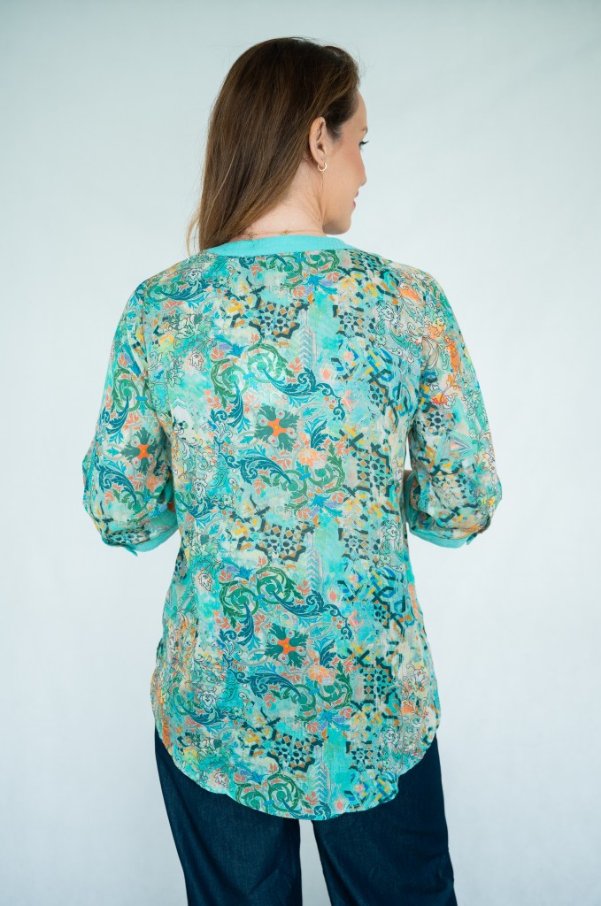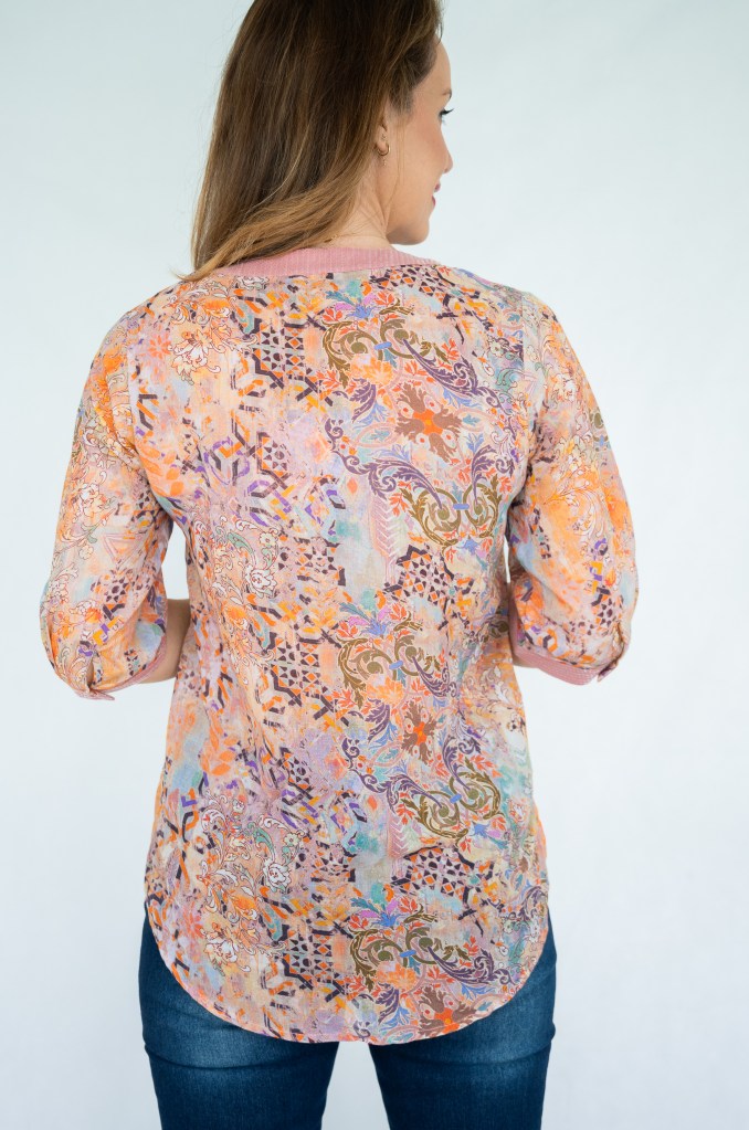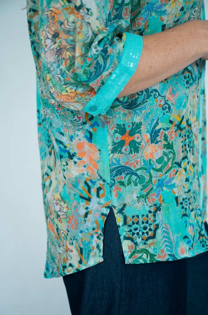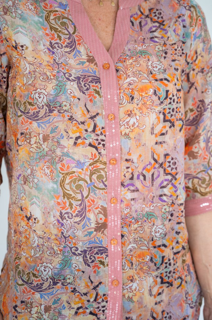 LINEN VISCOSE ABSTRACT FLORL PRT SLOT NK SEQUIN SHIRT