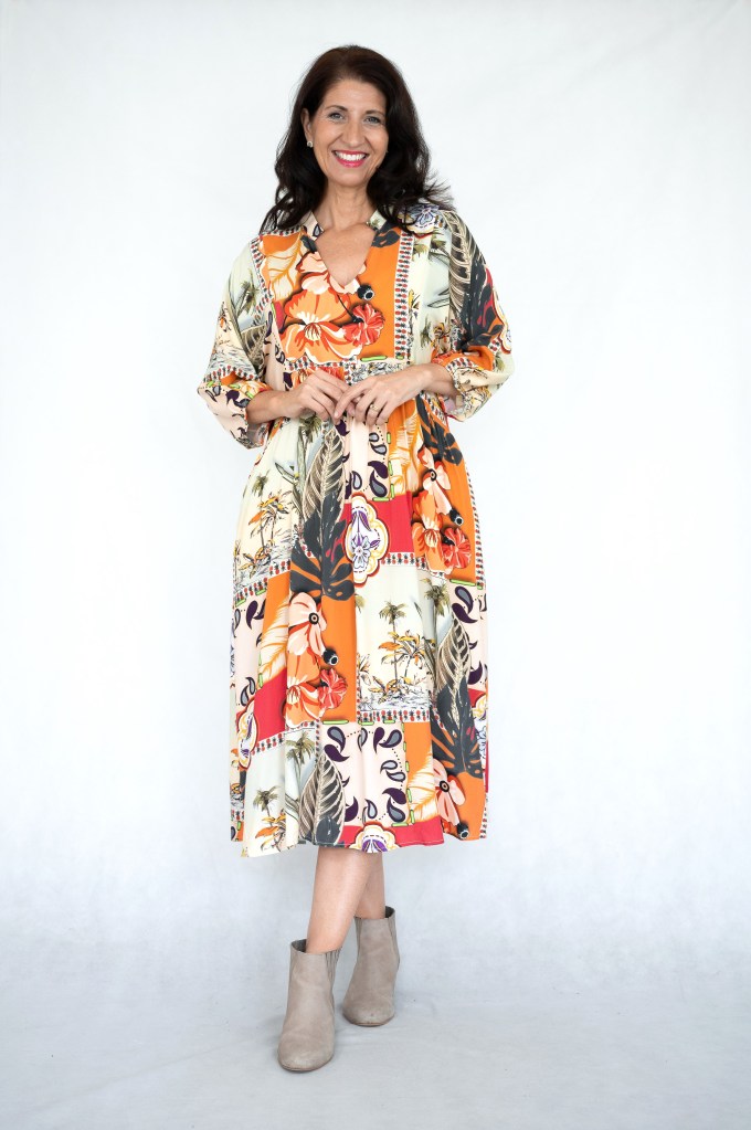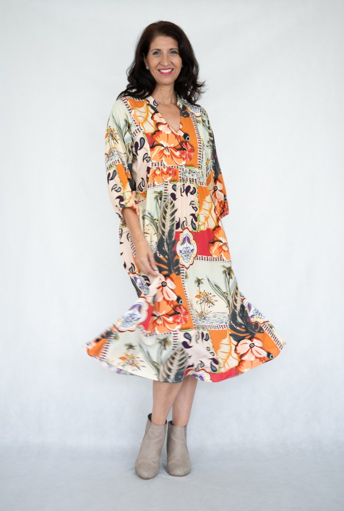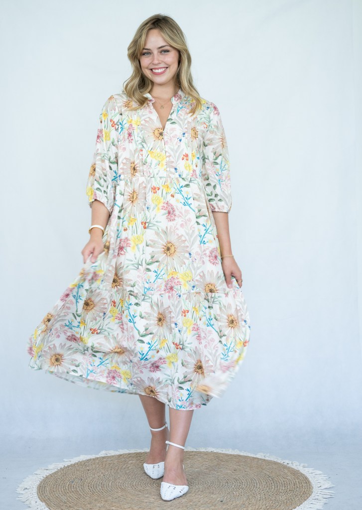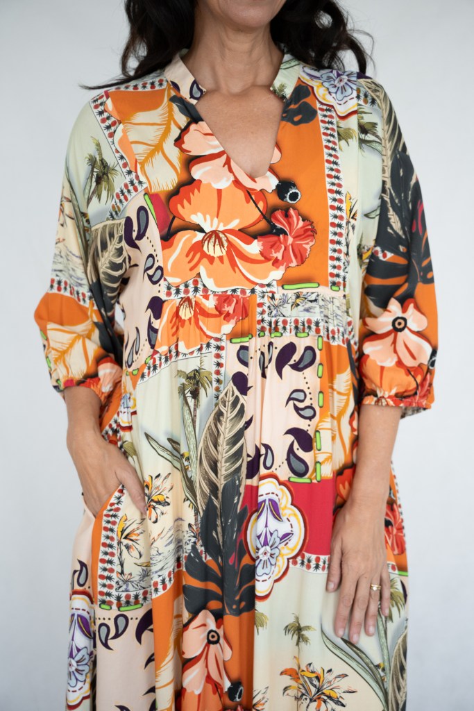 VISCOSE FLORAL BLOCK PRT STAND COLLAR 3Q/S PEASANT DRESS