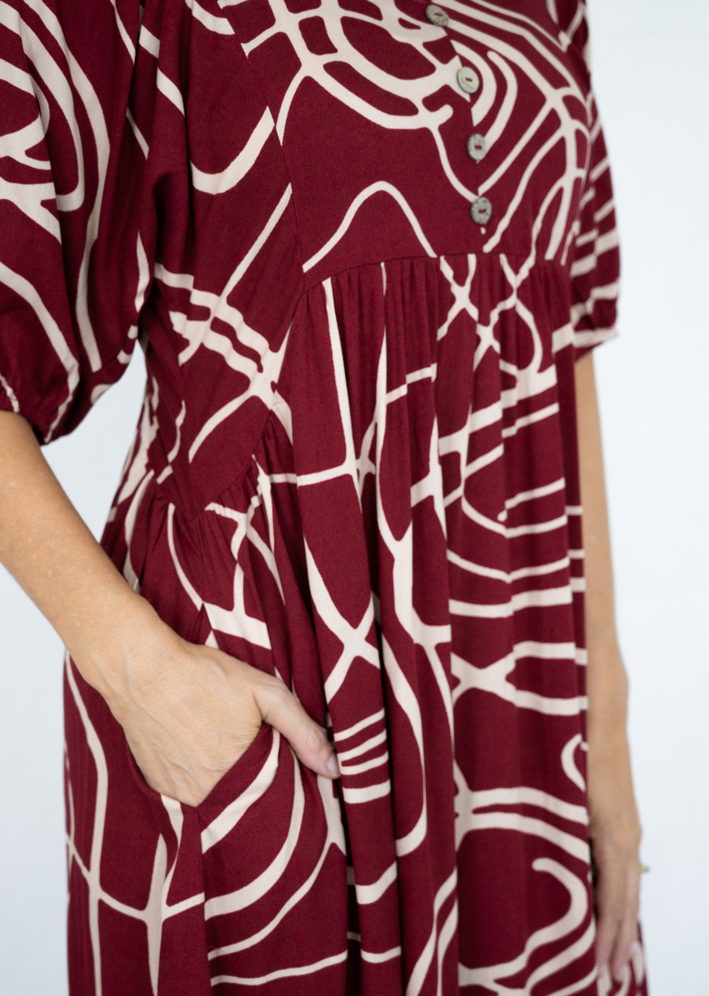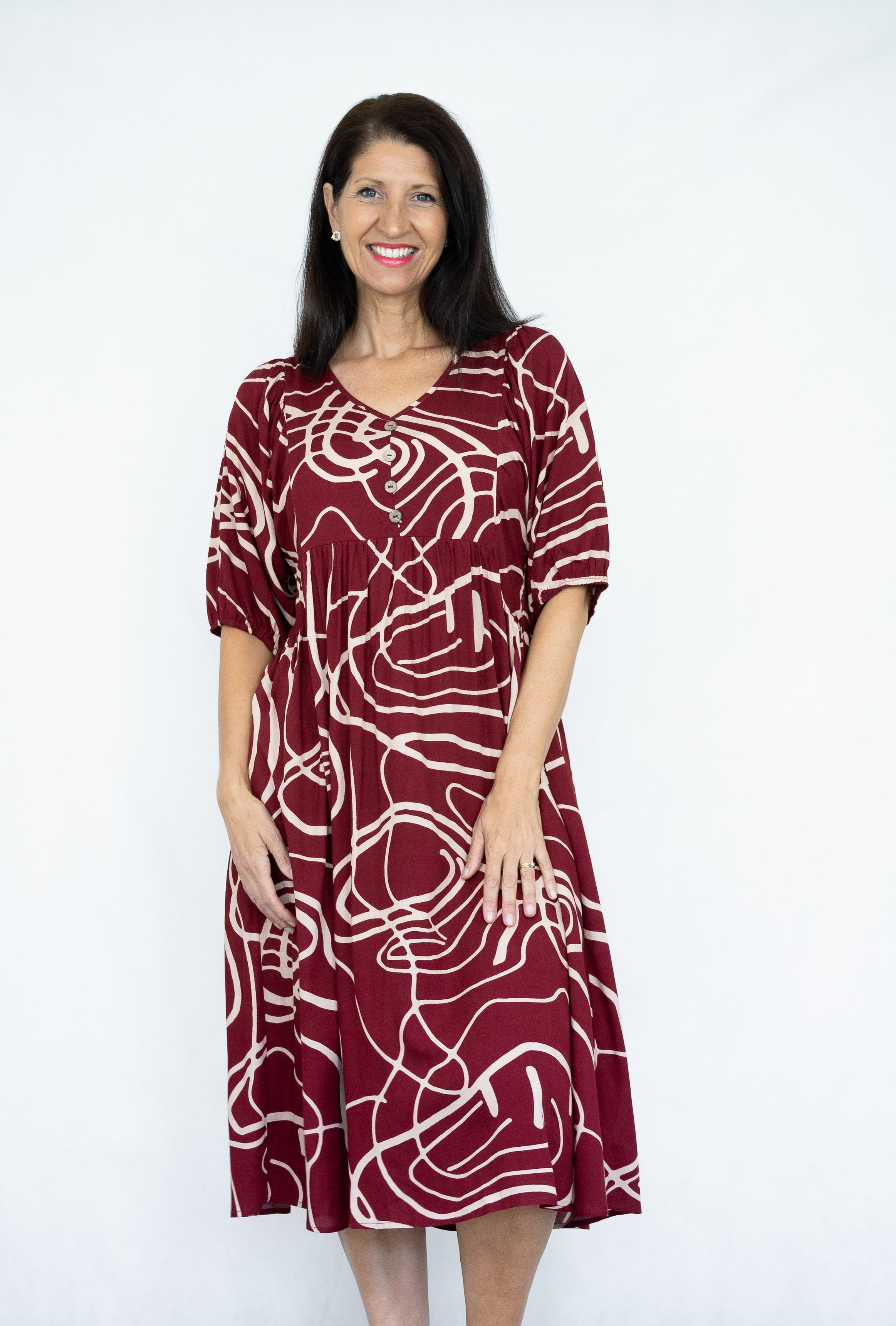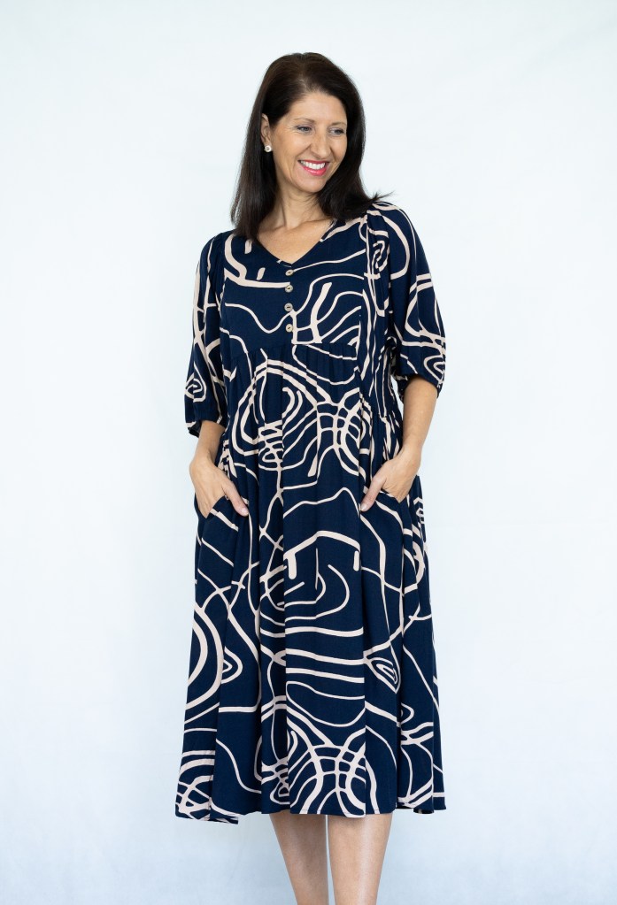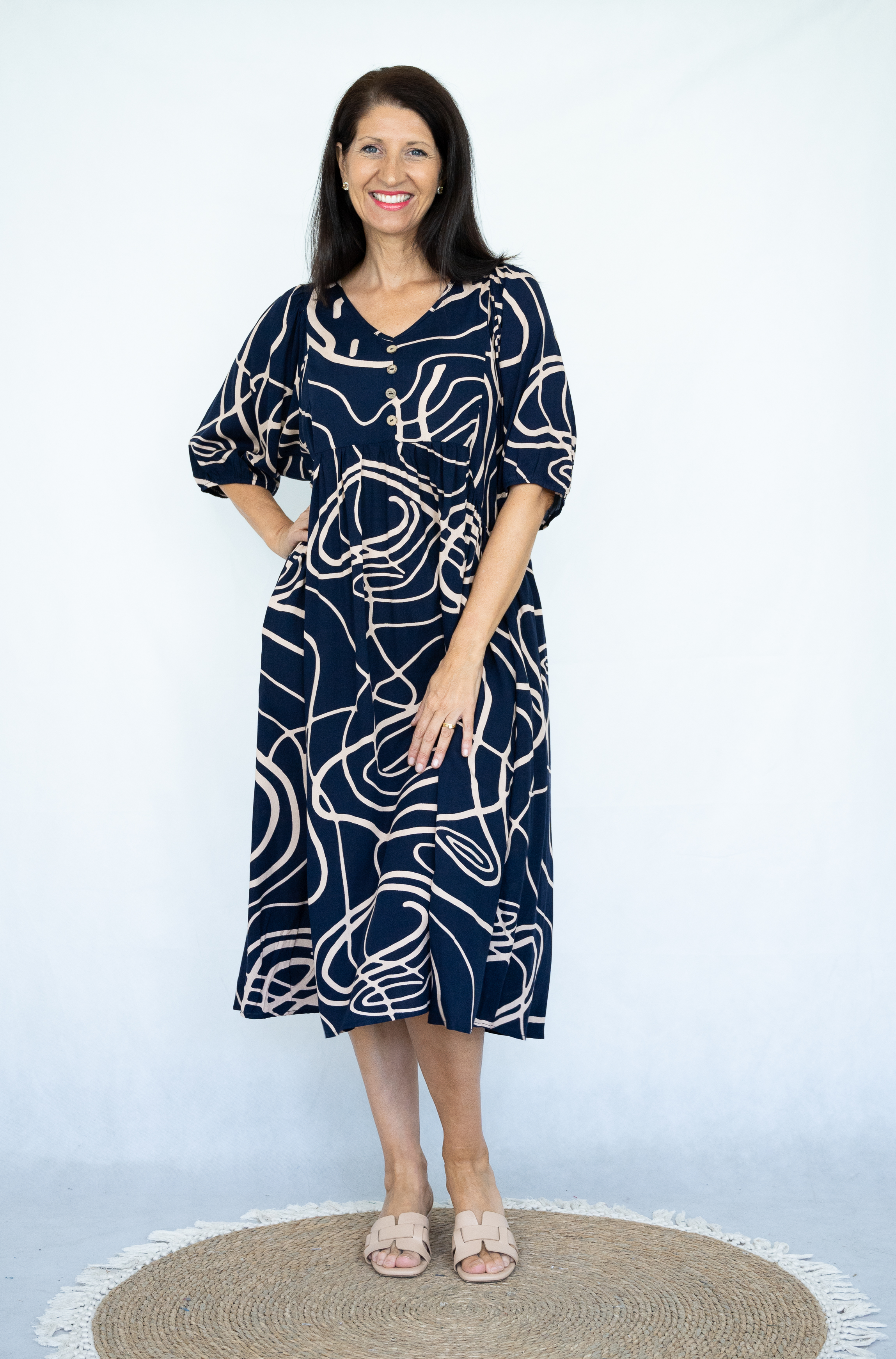 RAYON SCRIBBLE PRT V/N PEASANT DRESS