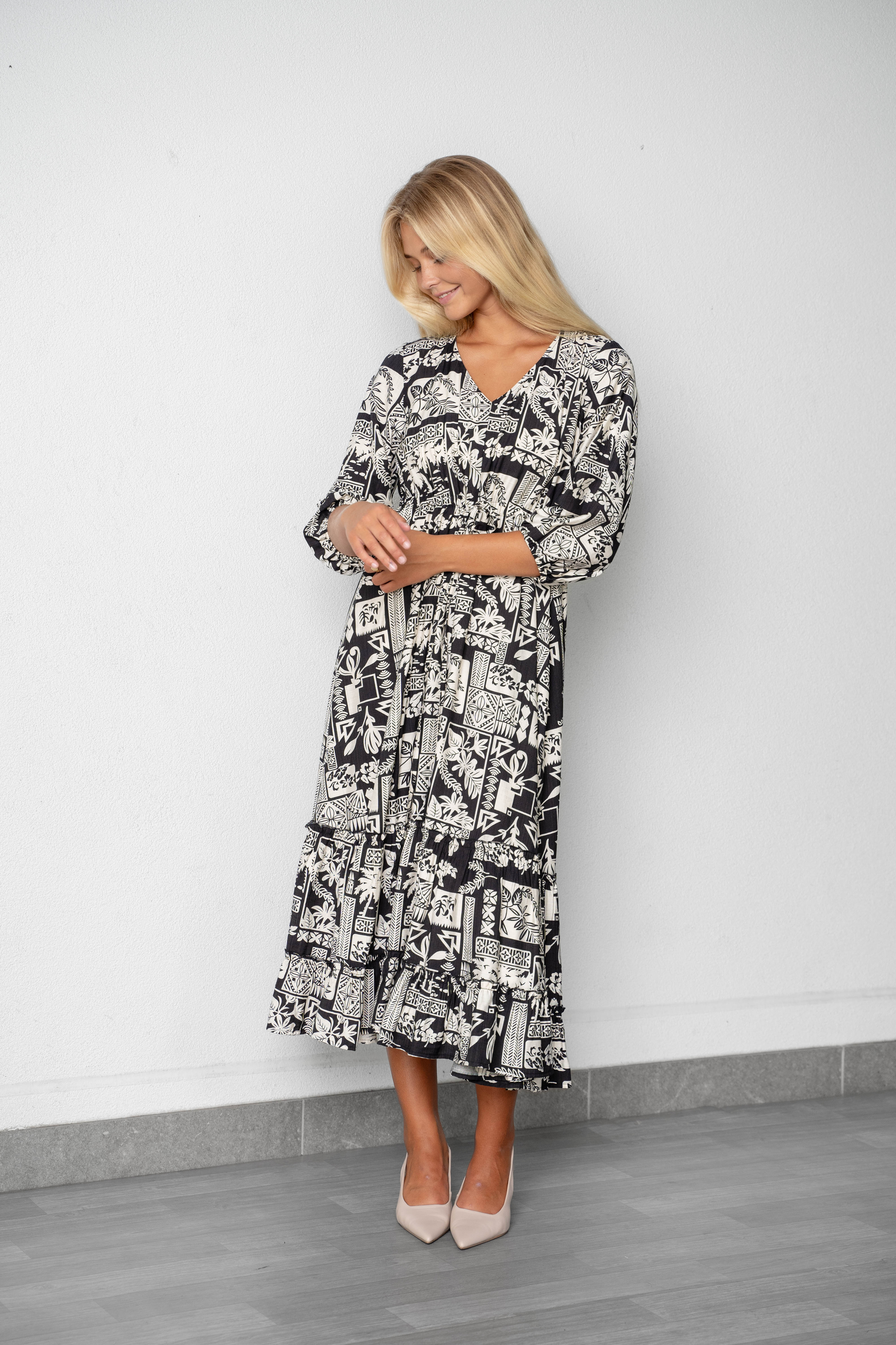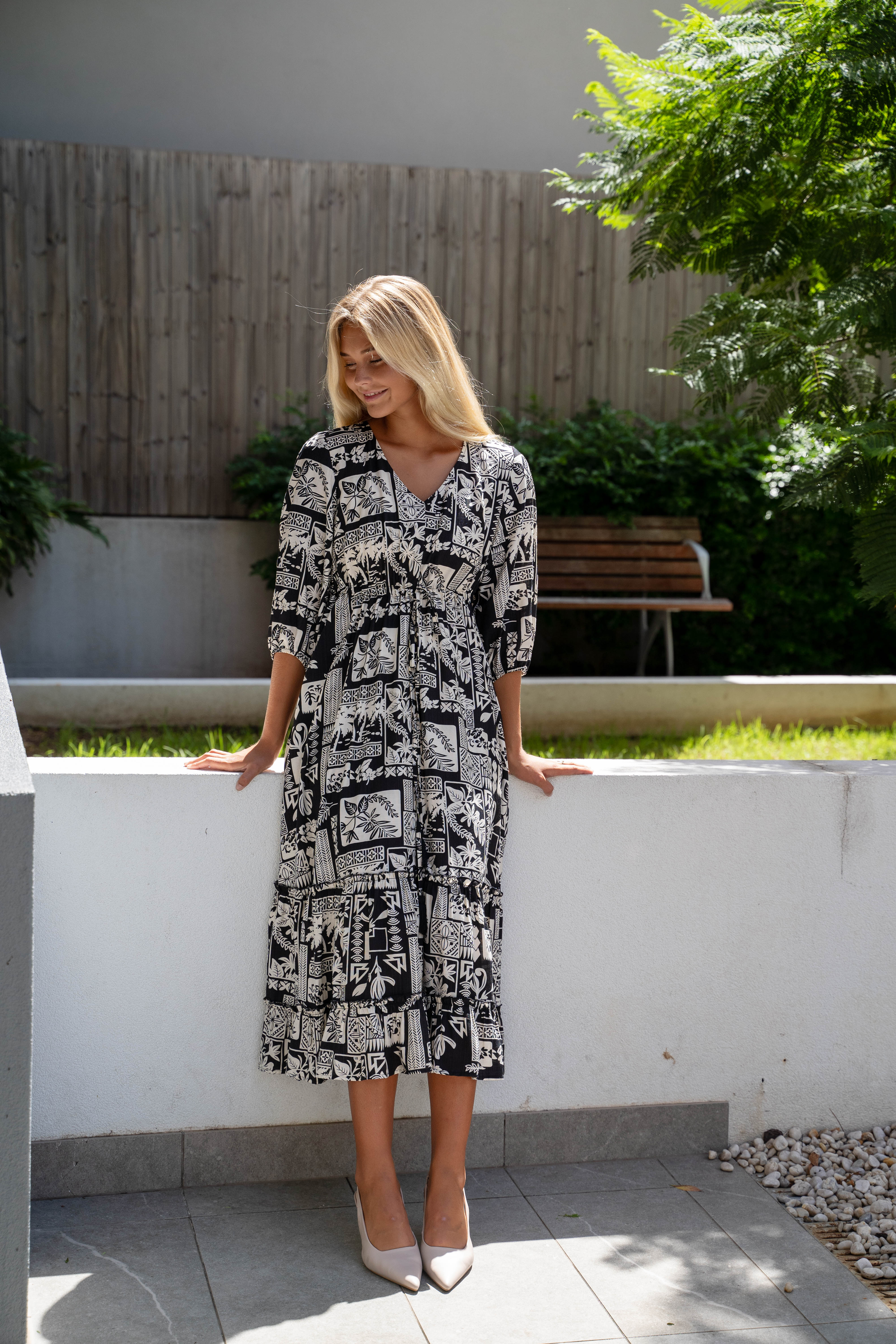 VISCOSE/POLY BLOCK PRT 3Q ELASTIC SLV TIERED DRESS
