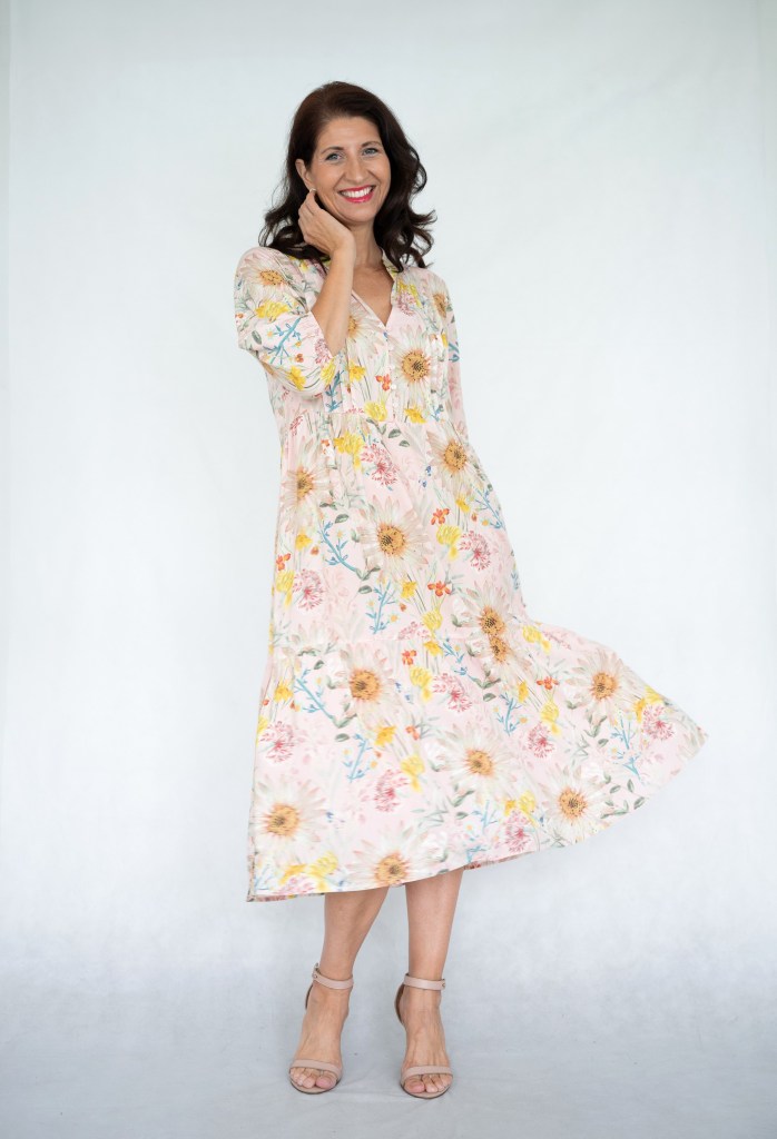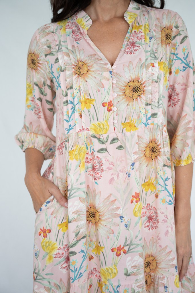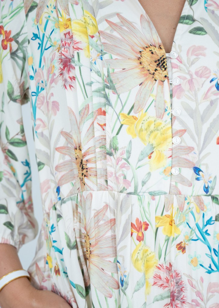 RAYON DAISY PRT PLEAT DETAIL DRESS