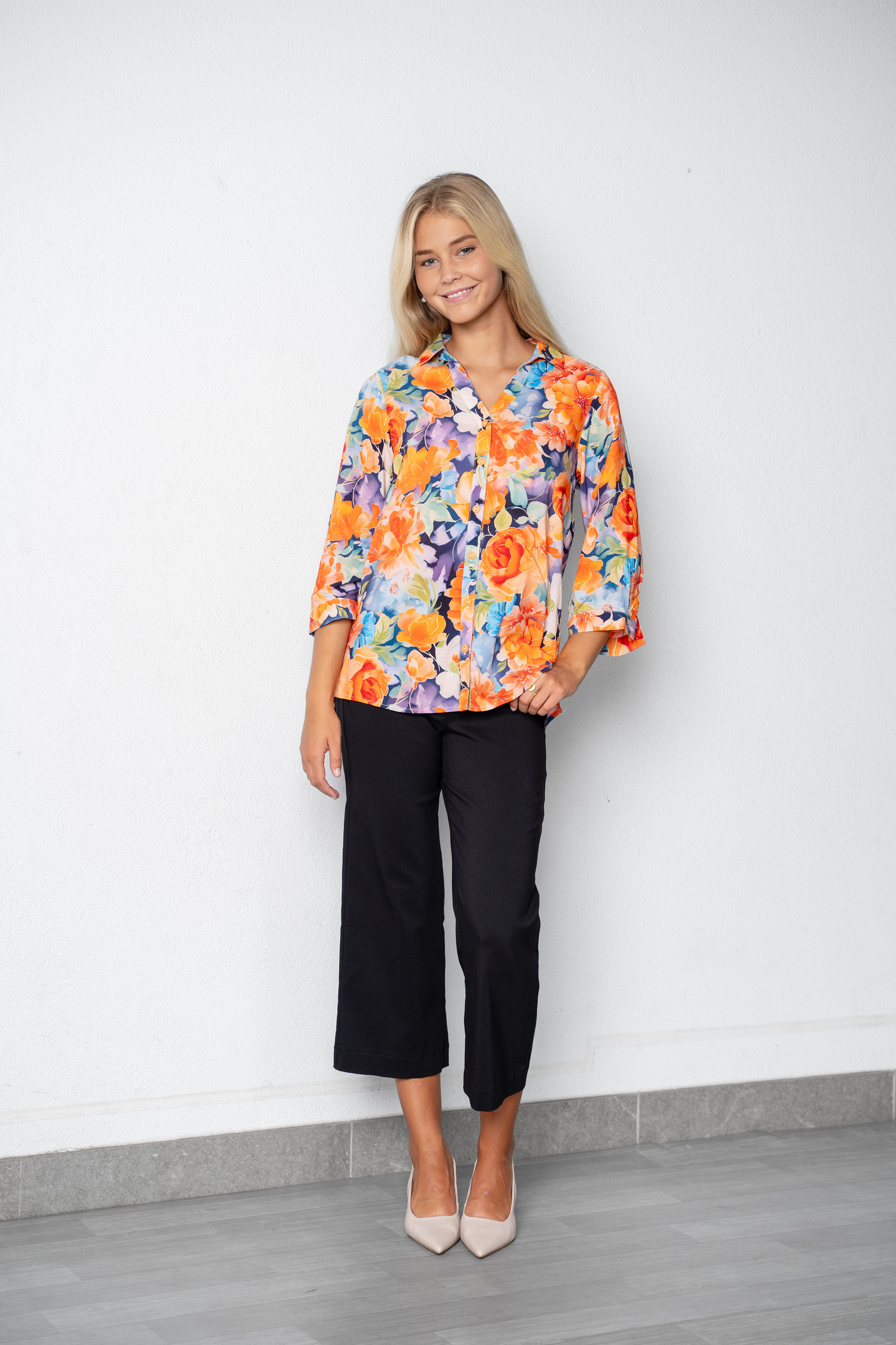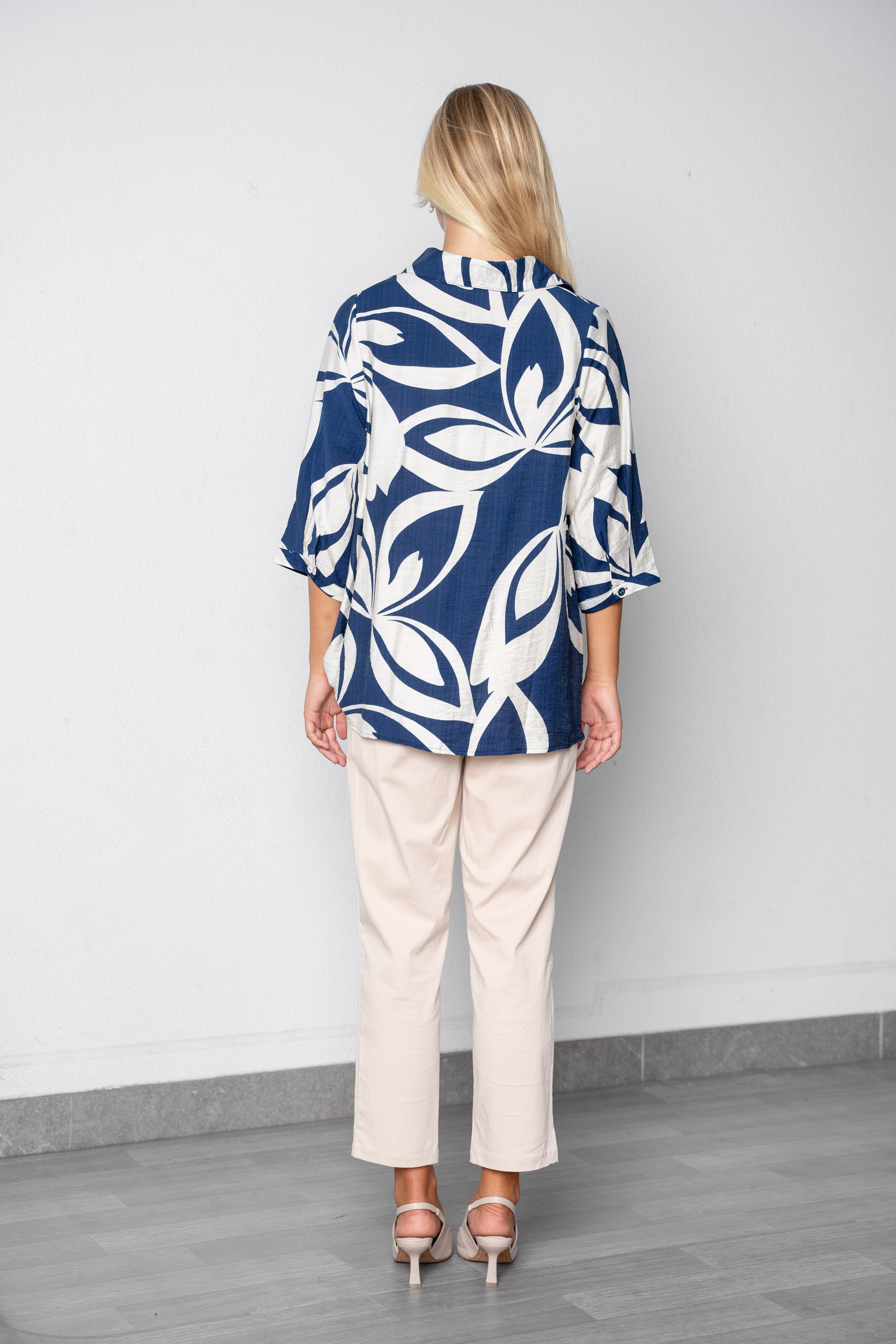 COTTON FLORAL PRT ROLL SLV BLOUSE