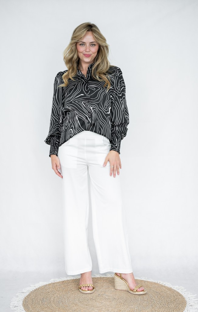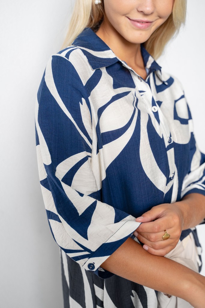 POLY ABSTRACT PRT SHIRRING CUFFS BLOUSE