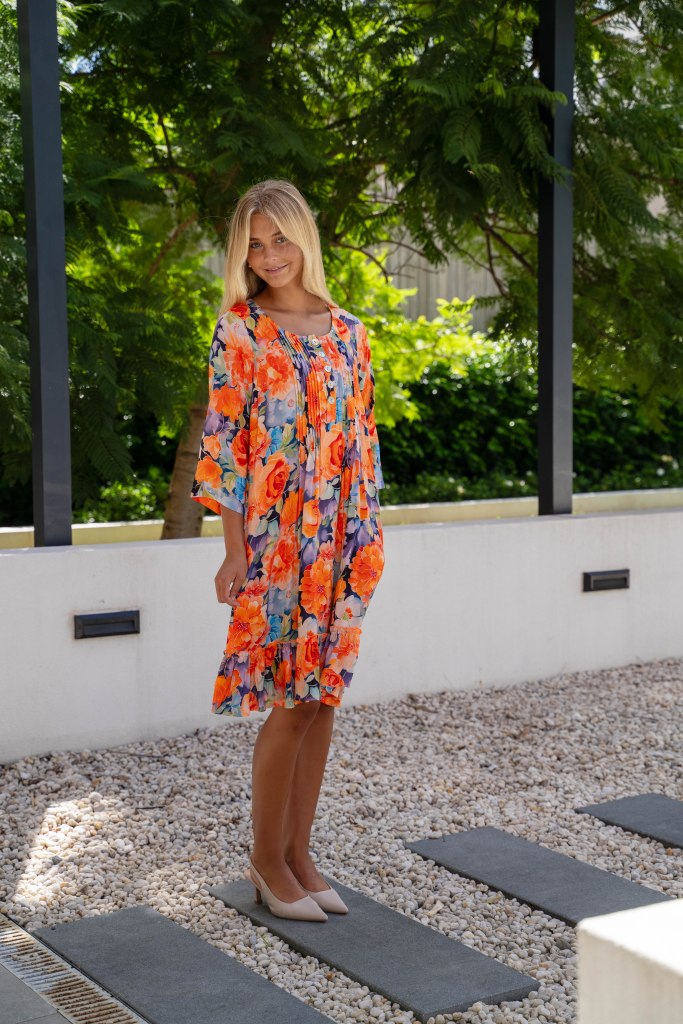 COTTON FLORAL PRT PLEATED 3Q/S FRILL DRESS