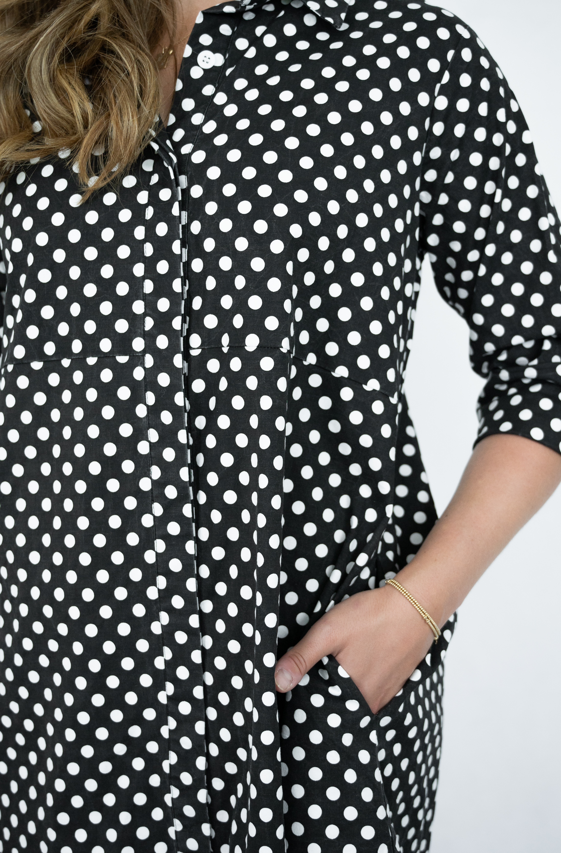 COTTON/POLY/SPANDEX POLKA DOT 3Q/S SHIRT DRESS