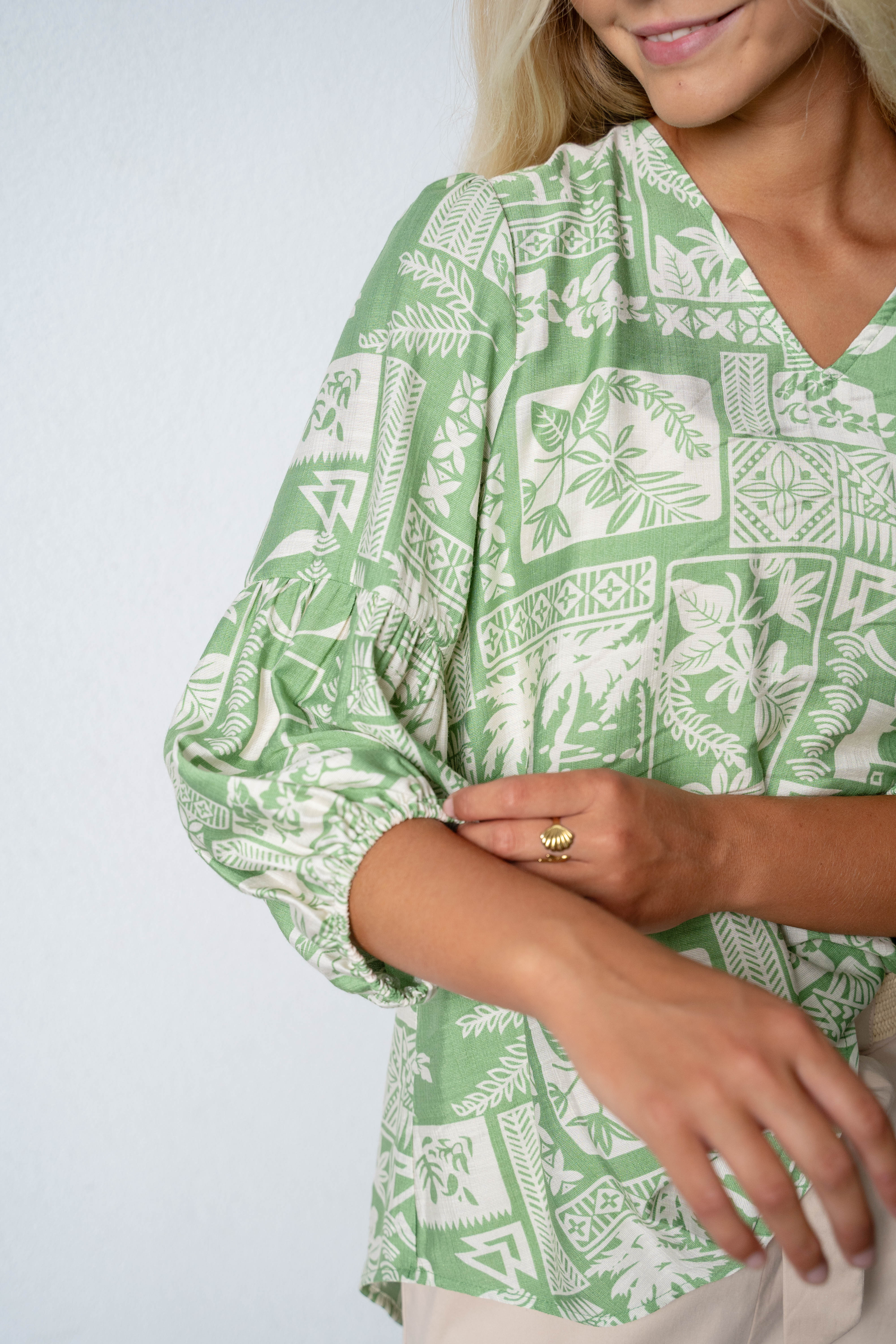 VISCOSE/POLY BLOCK PRT V NK PUFF SLV TOP