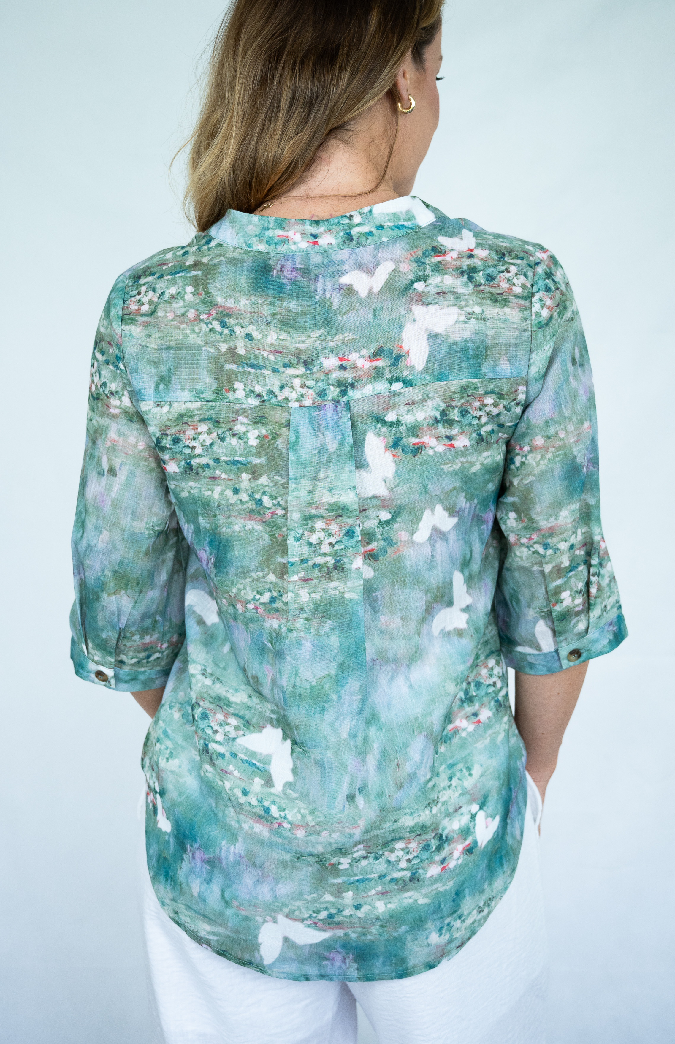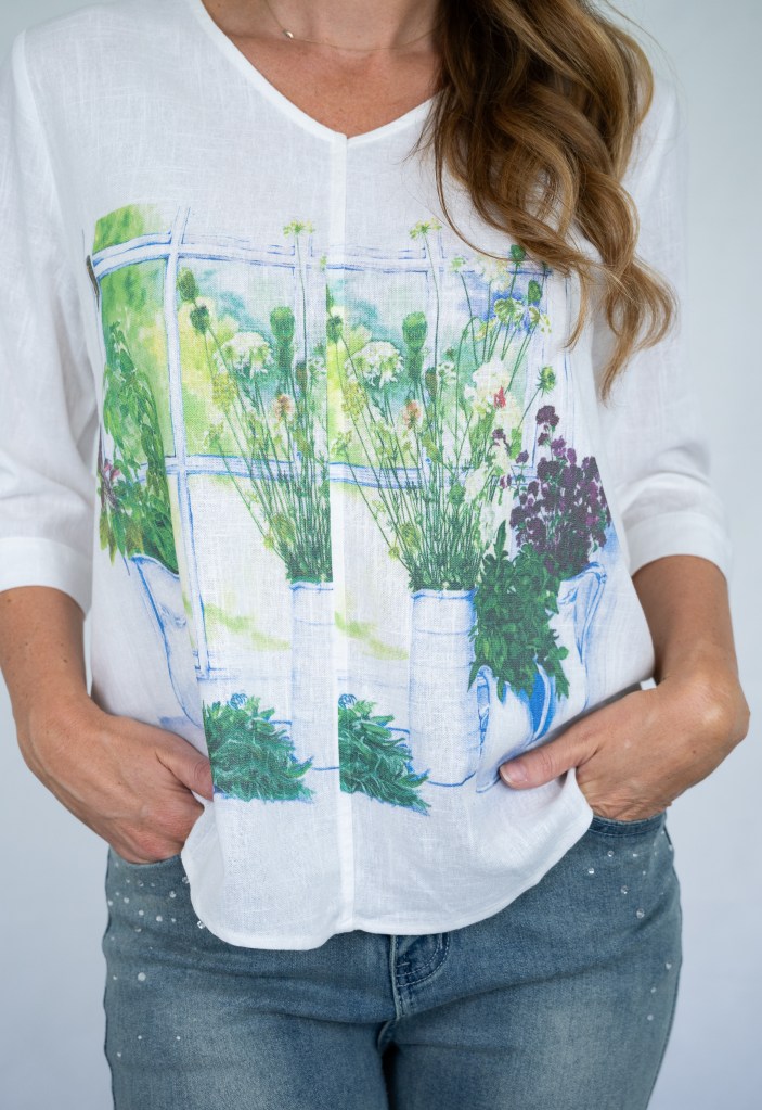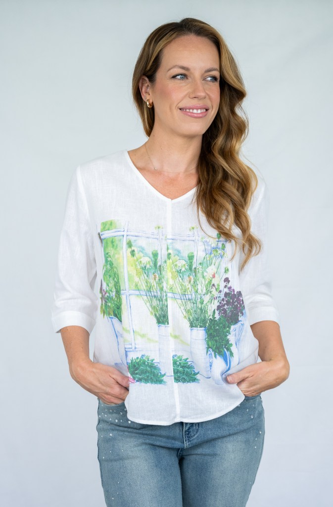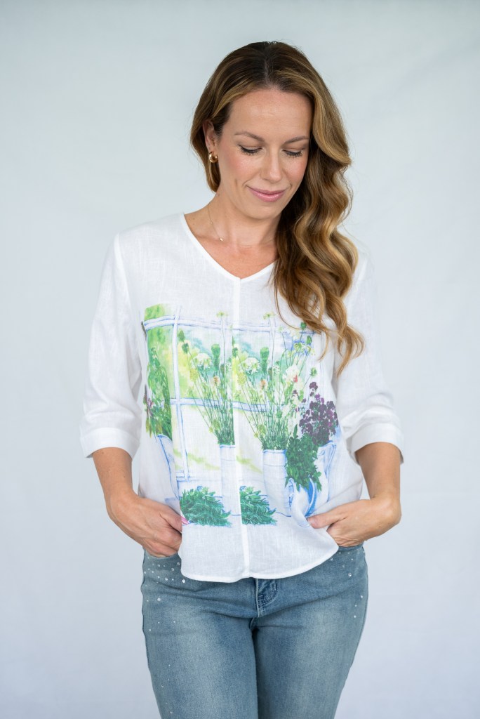 52036 WH COTTON LINEN GARDEN PRT V/N 3/4 SLV TOP SIZES: 8-18