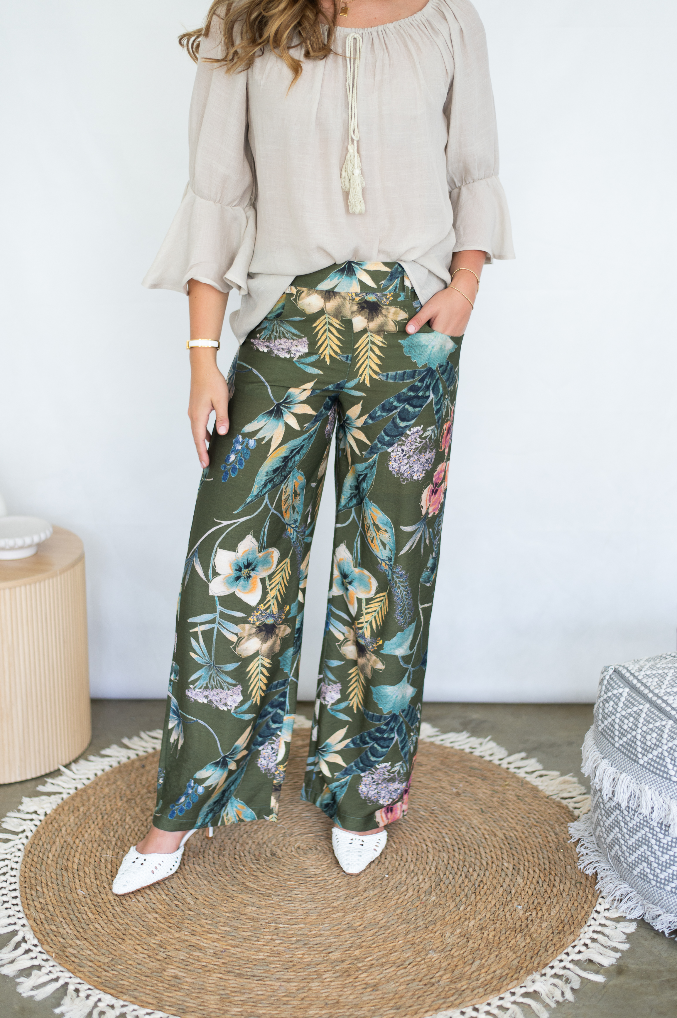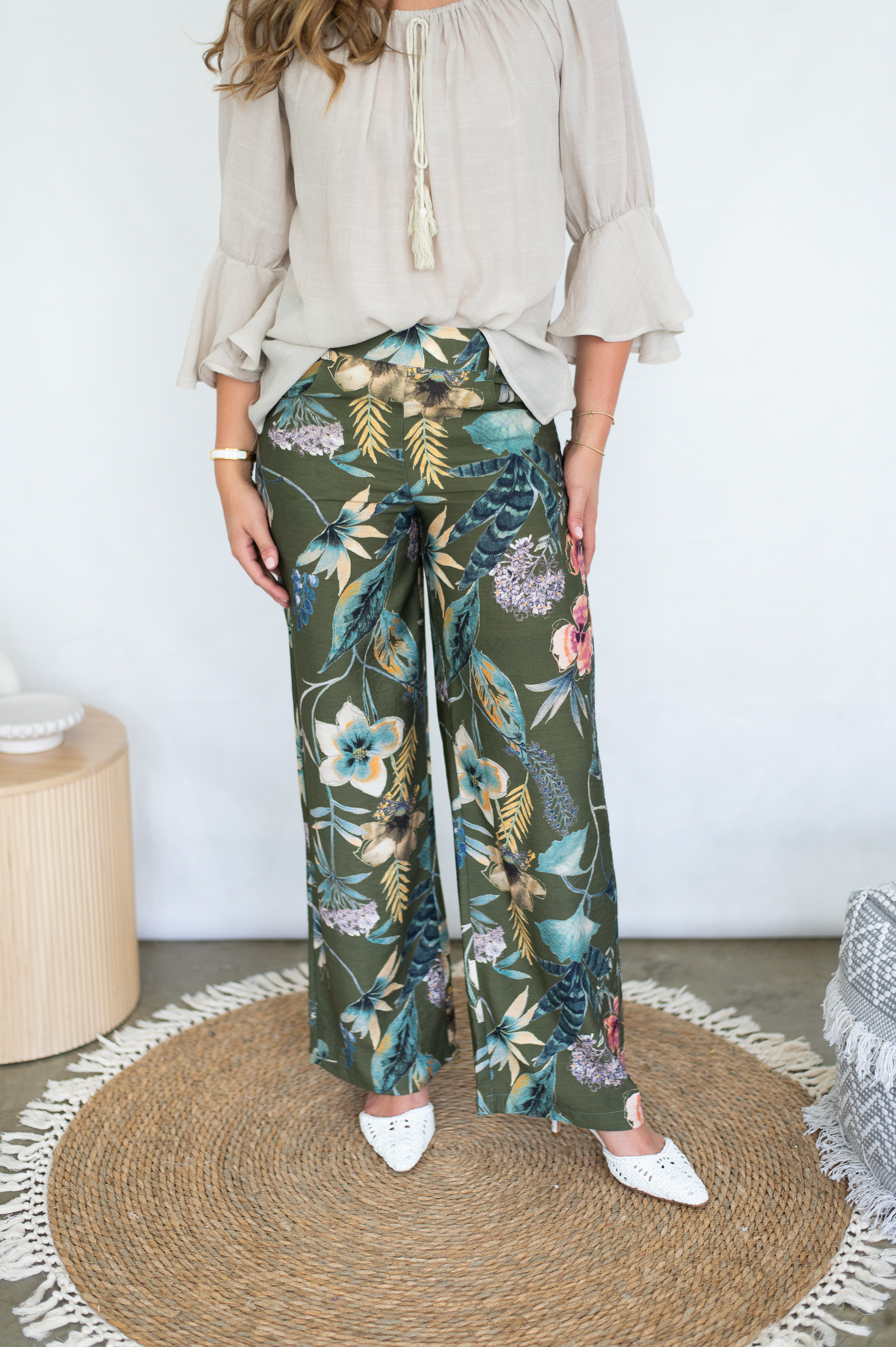 36373B OL VISCOSE/POLY TROPICAL PRT WIDE LEG PANTS SIZES: 8-16