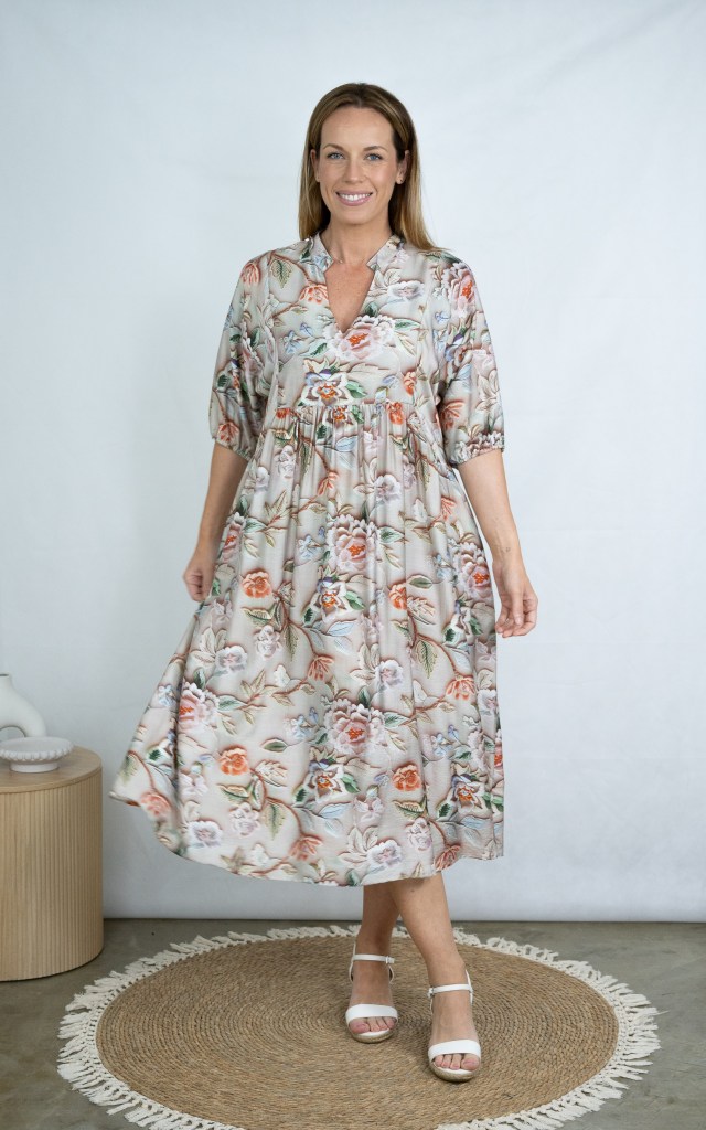 38957 TG LINEN/POLY ABSTRACT PRT BTN FRONT 3Q/S DRESS SIZES: 8-20