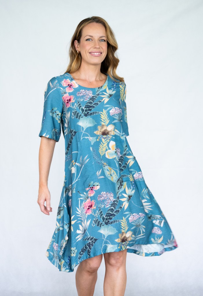 38921-1 DN VISCOSE/POLY TROPICAL PRT POCKET DETAIL S/S DRESS SIZES: 8-20