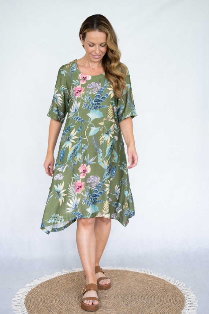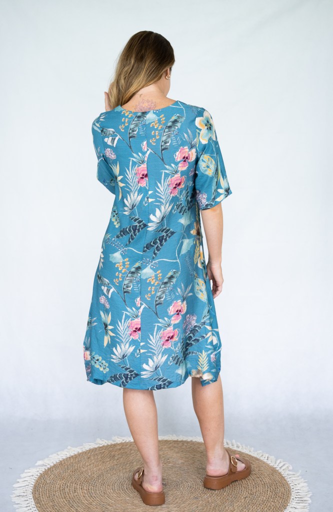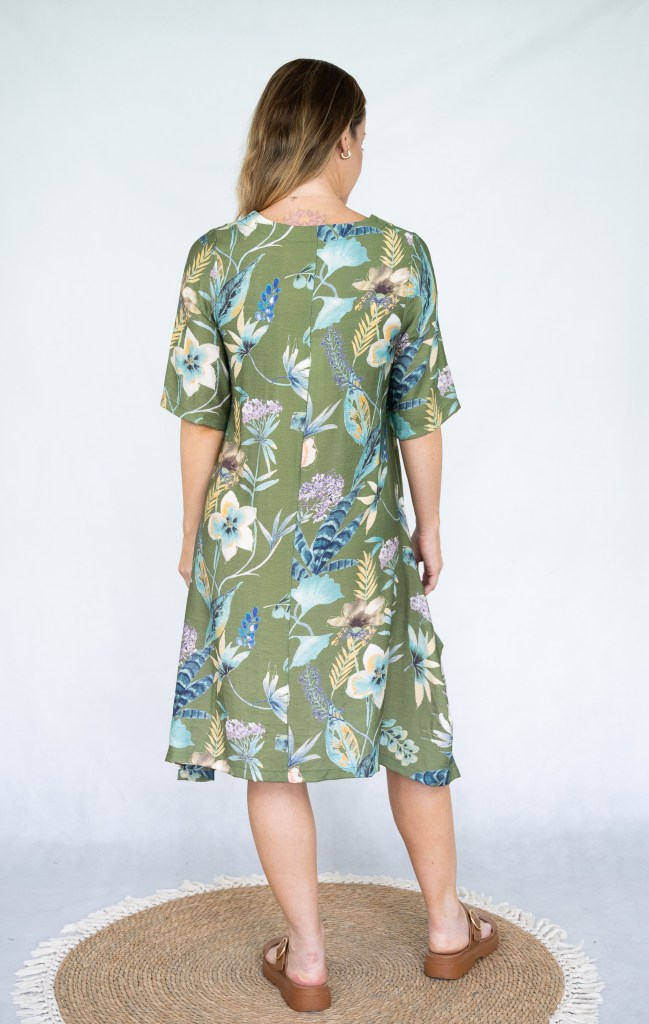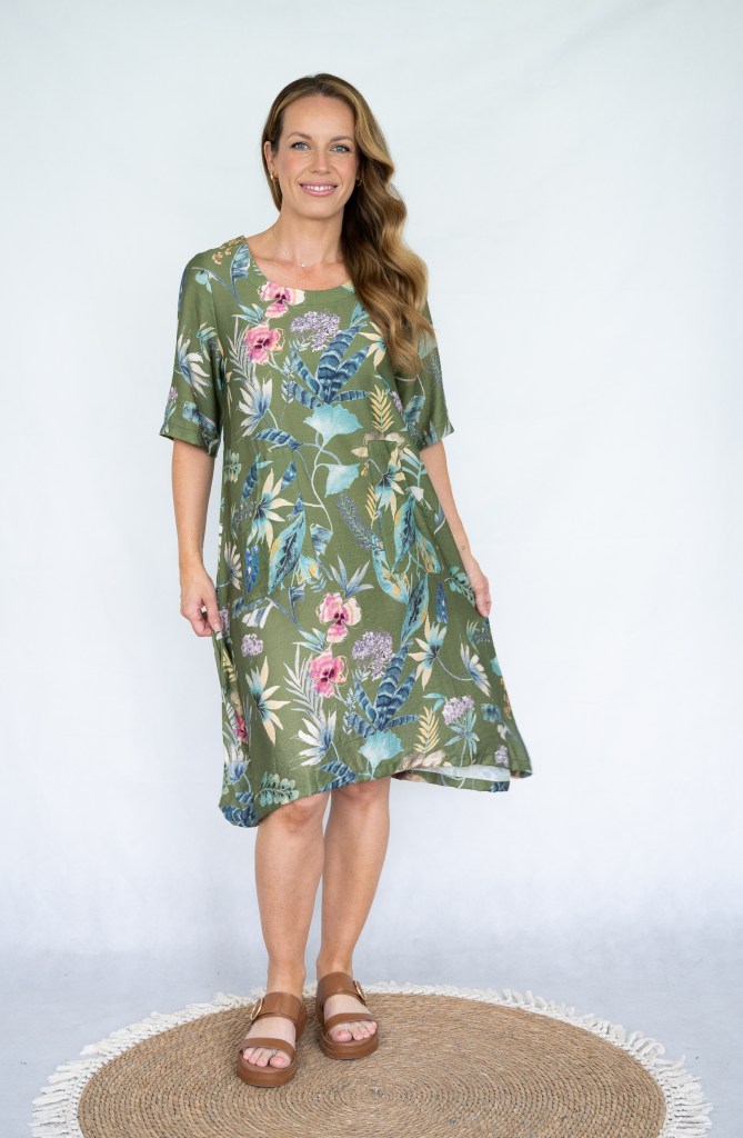 38921-1 OL VISCOSE/POLY TROPICAL PRT POCKET DETAIL S/S DRESS SIZES: 8-20