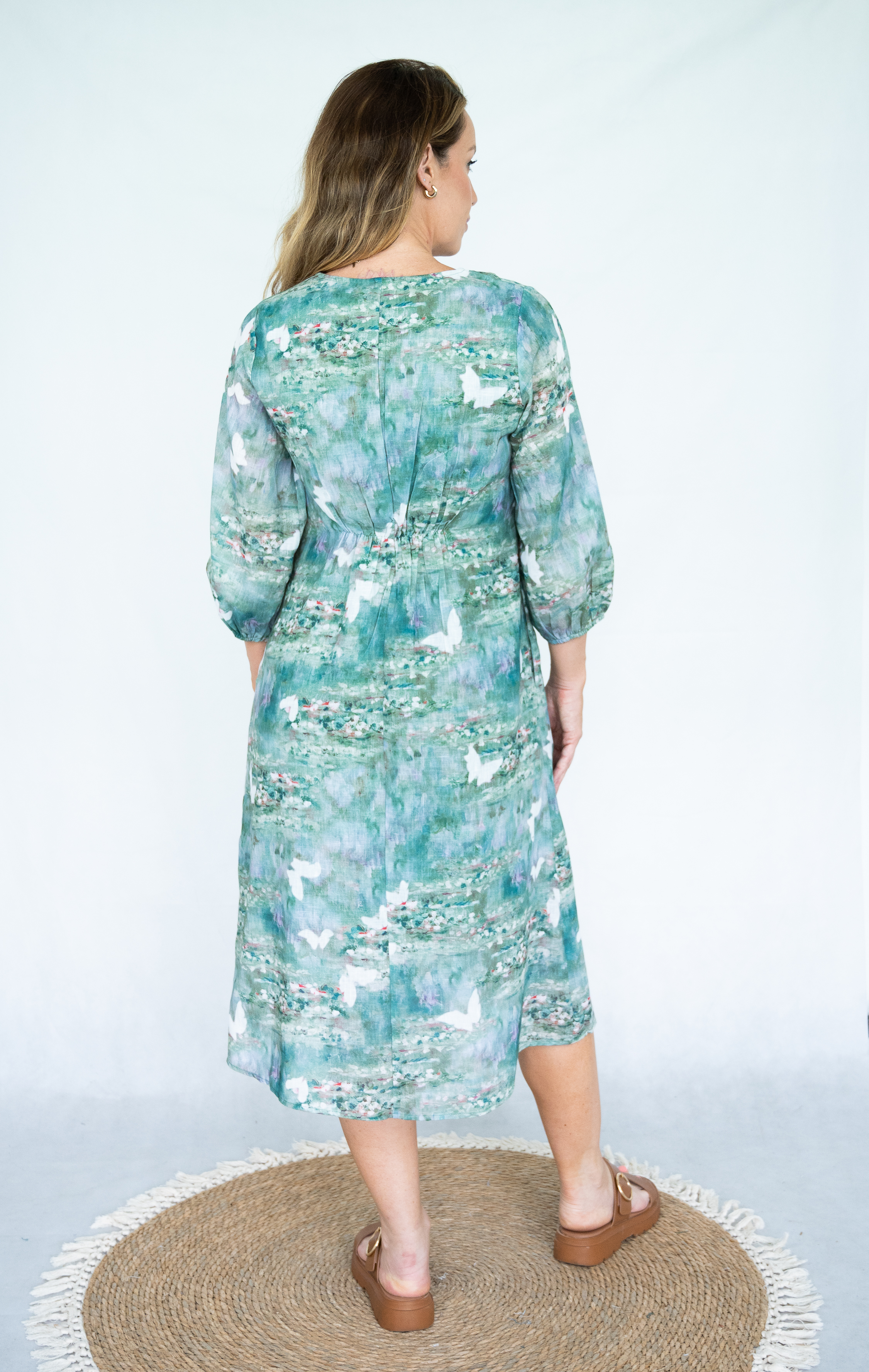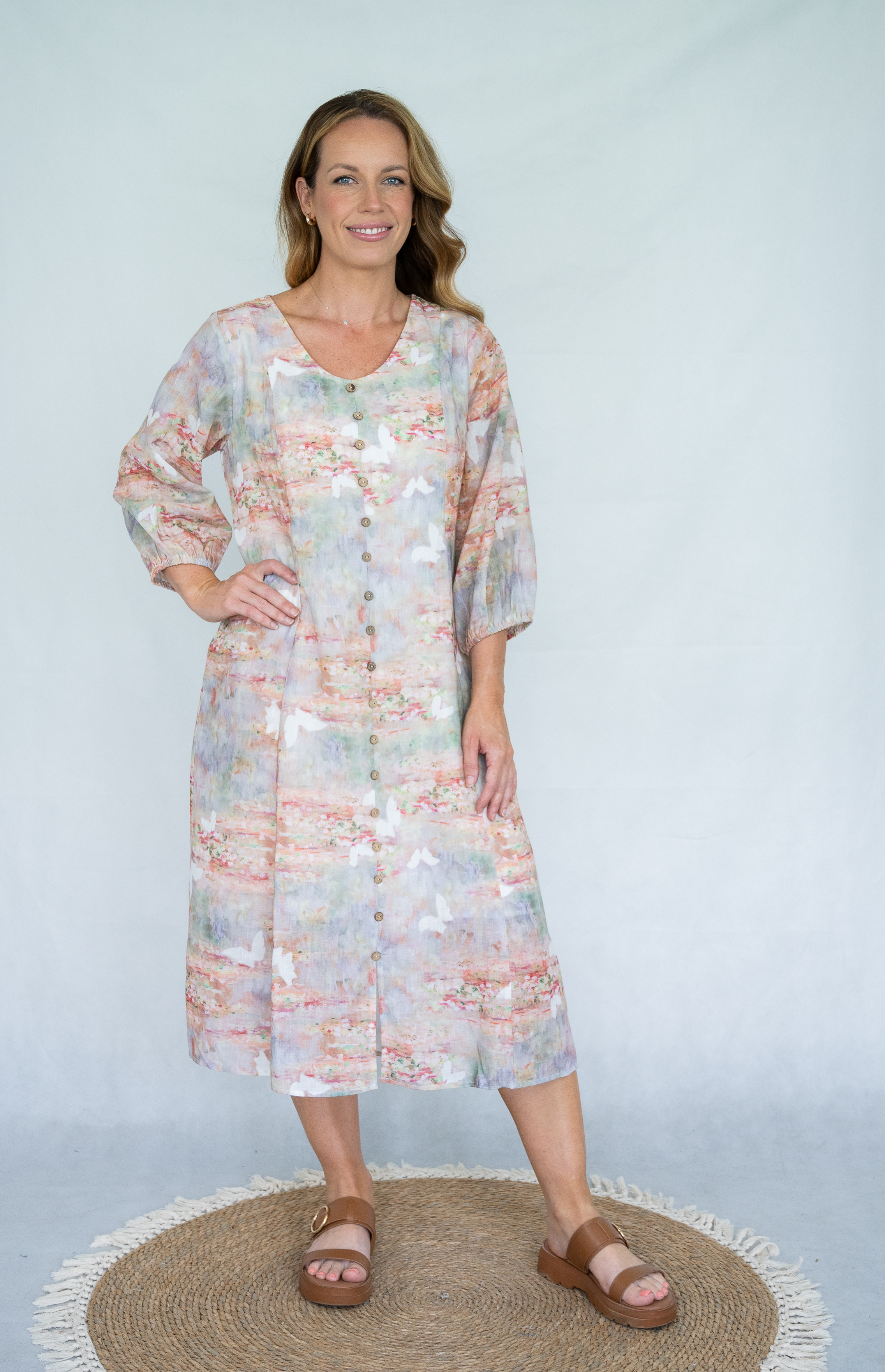 38957 TE LINEN/POLY ABSTRACT PRT BTN FRONT 3Q/S DRESS SIZES: 8-20
