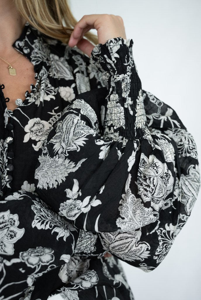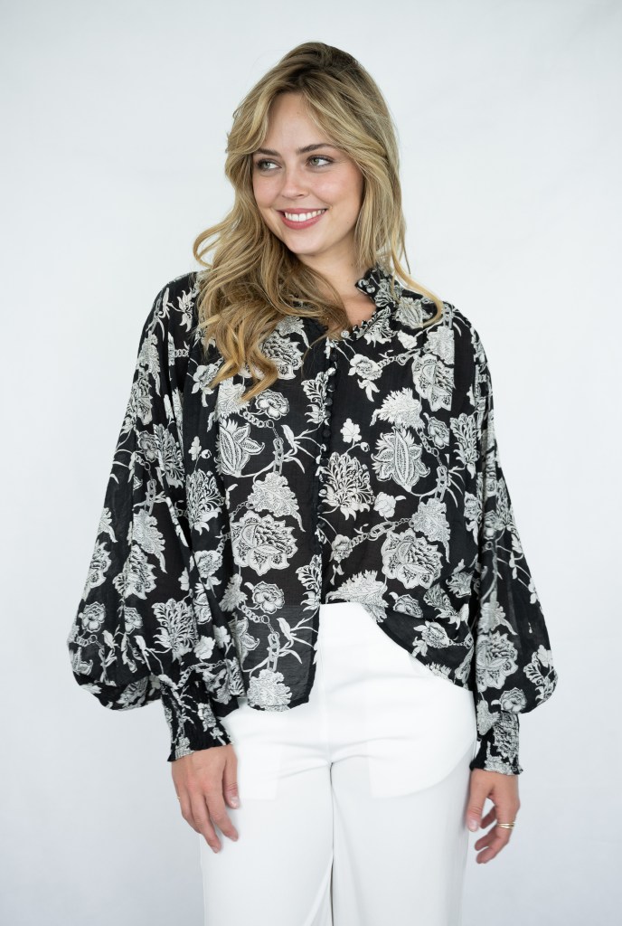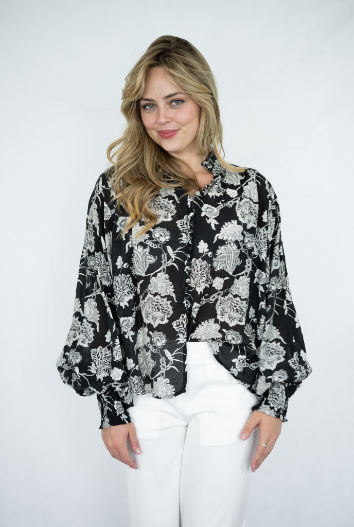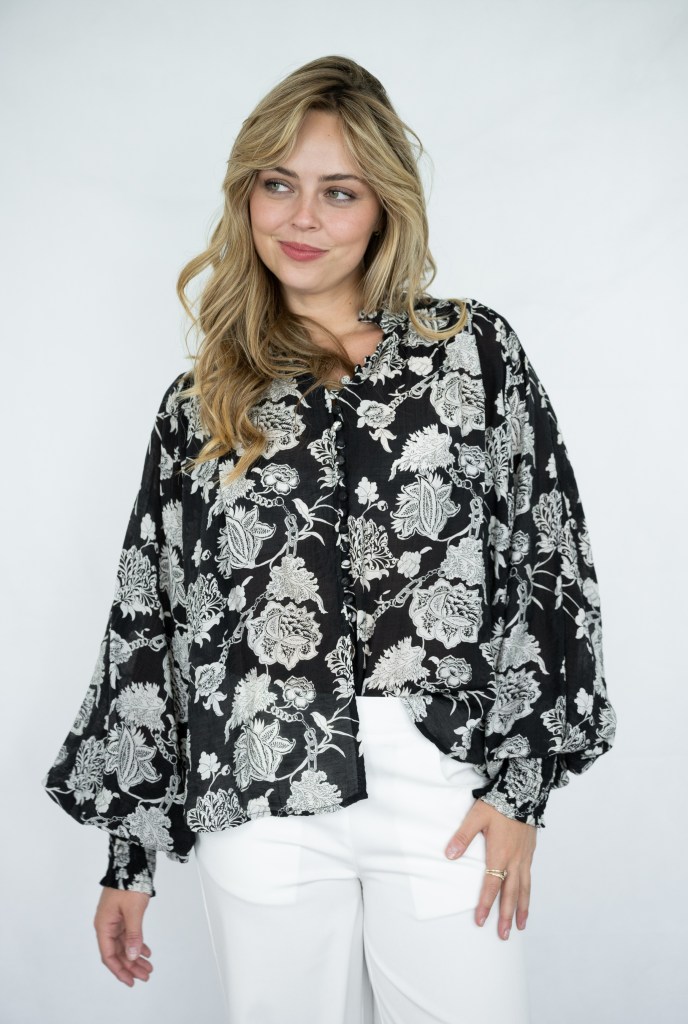 33717 BK VISCOSE/POLY FLORAL PRT BALLON SLV HIGH NK SHIRT SIZES: 8-18